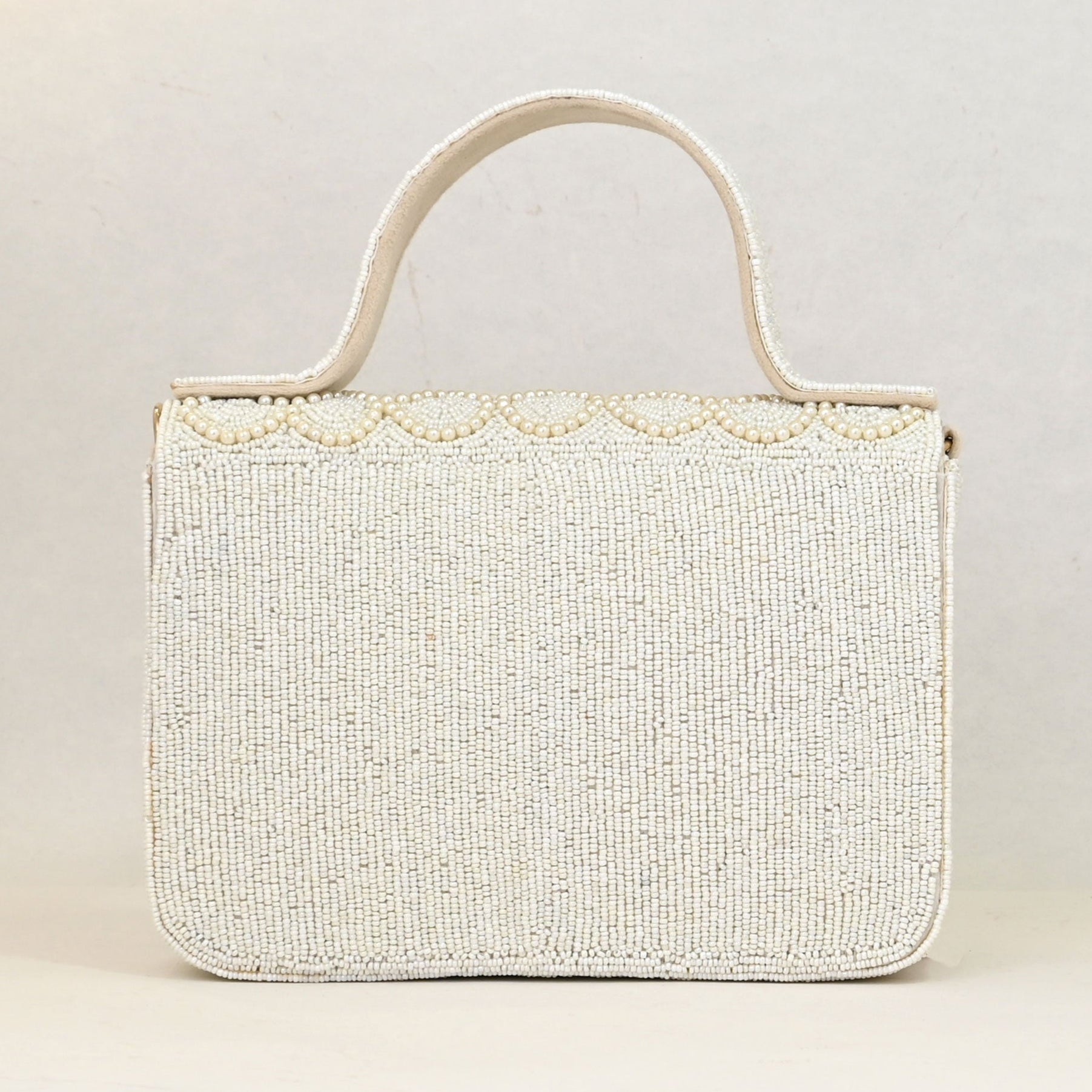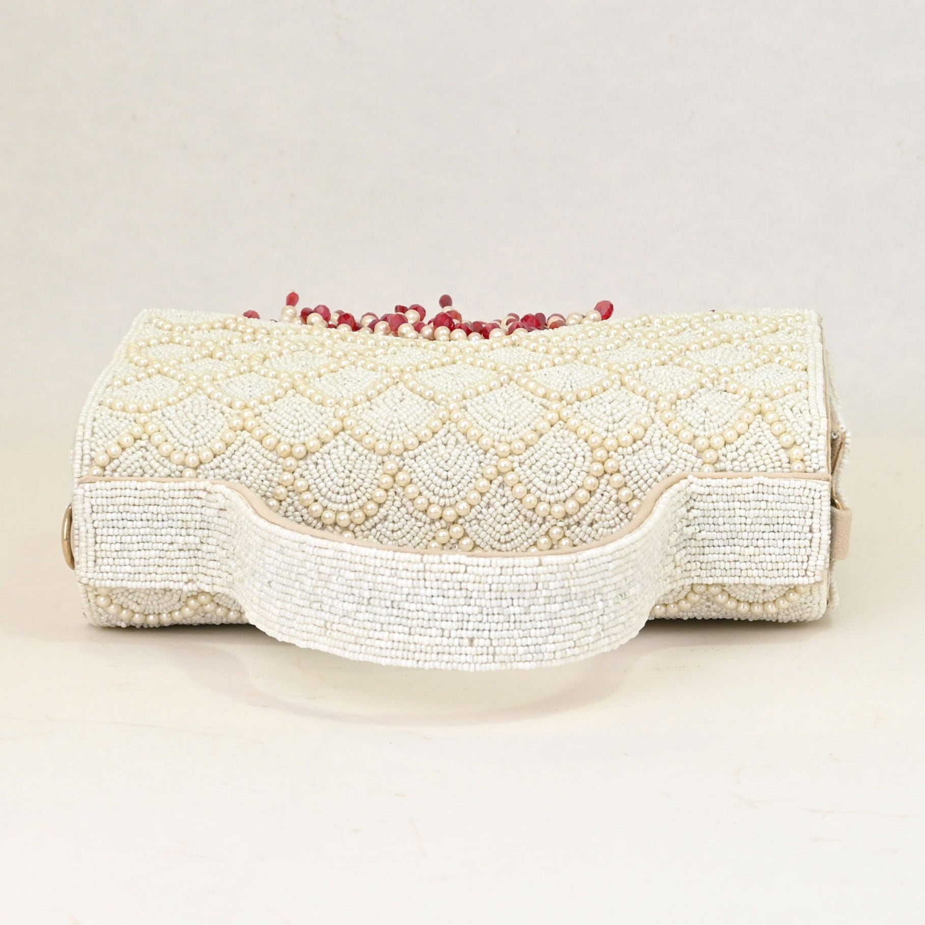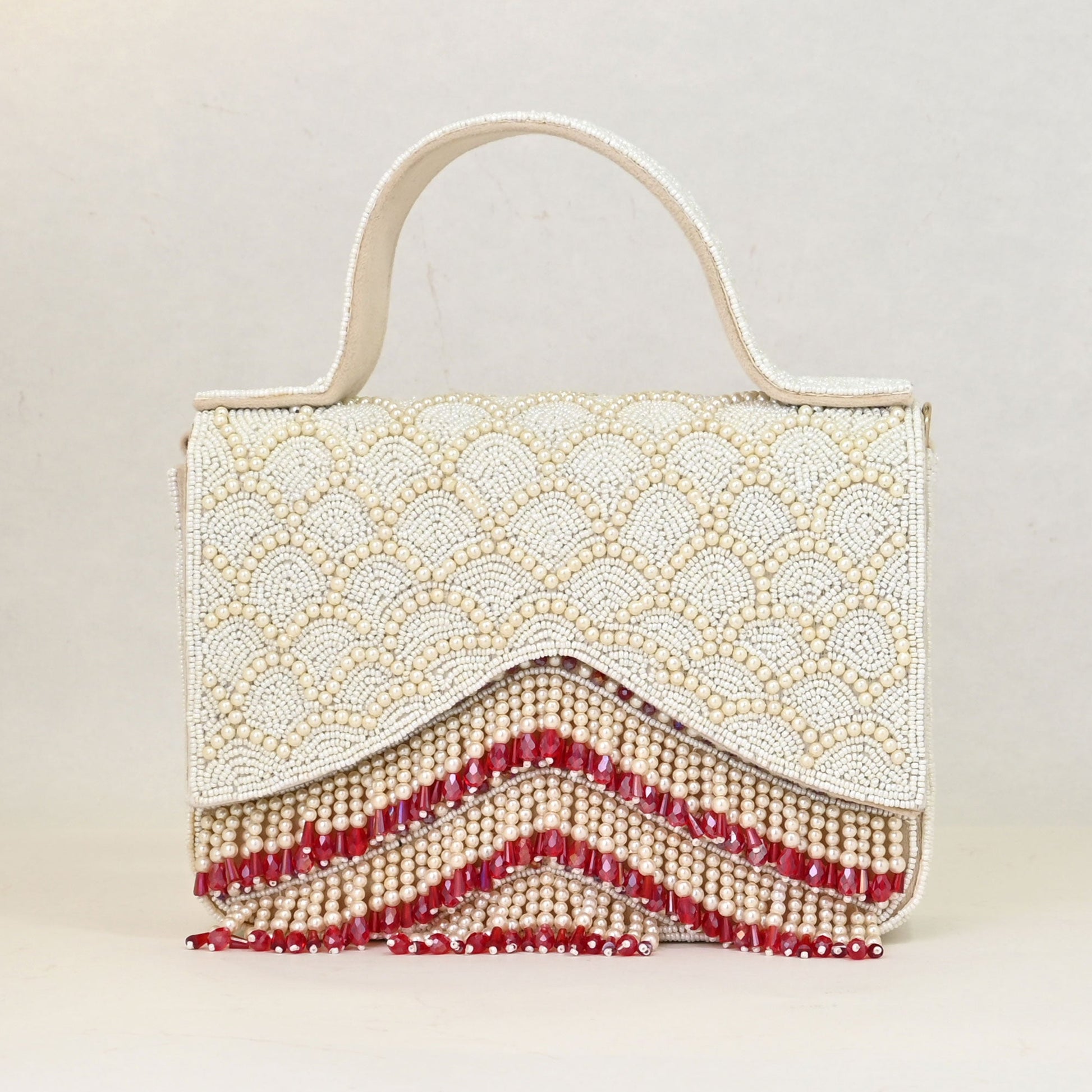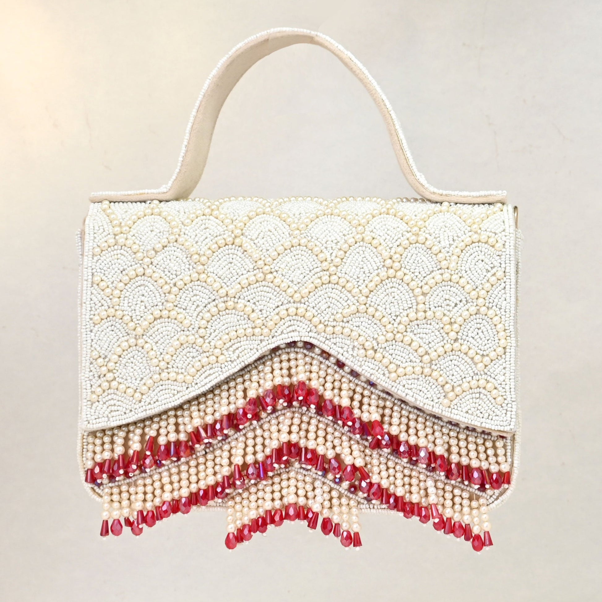 Intricate Design : Featuring hand-woven scallop patterns, this bag is adorned with shimmering pearls and beads, creating a soft, luxurious texture. The cascading wave-like fringe with ruby accents adds a dynamic touch of refinement.
