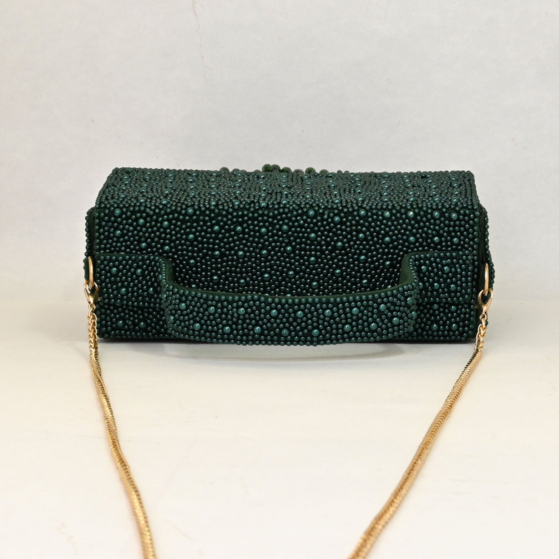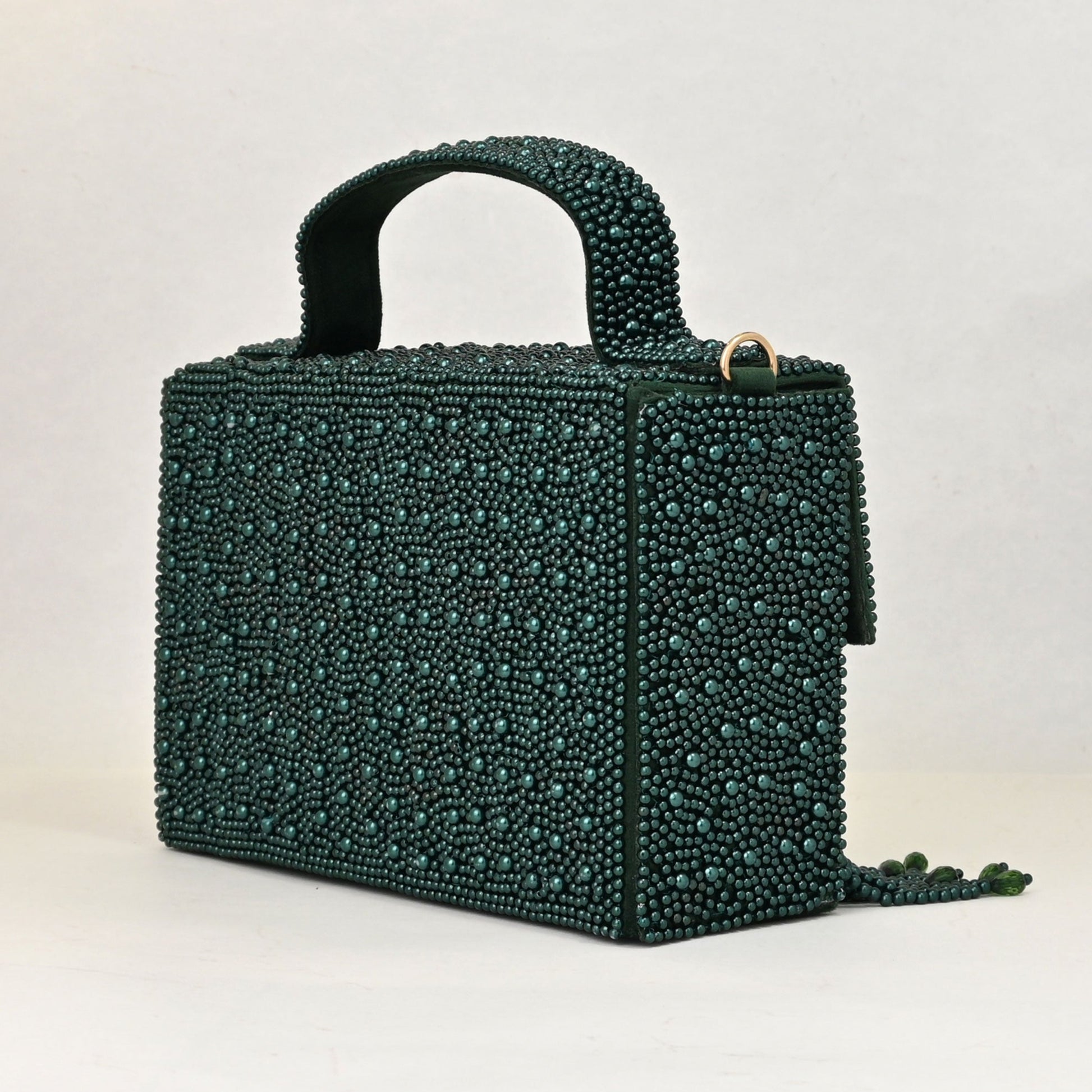 Exquisite Beading : Lavishly adorned with meticulously hand-sewn emerald-toned beads, this bag glimmers like a jewel. Cascading fringe details create an elegant movement, adding a dynamic and playful edge.
