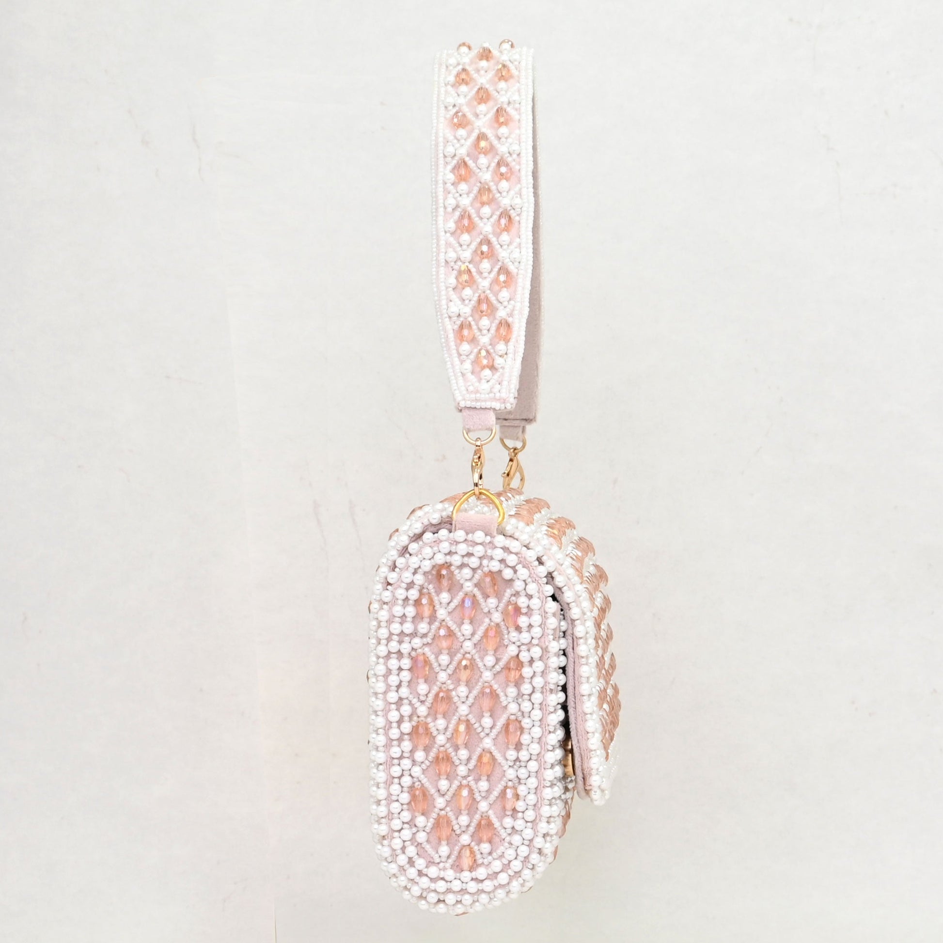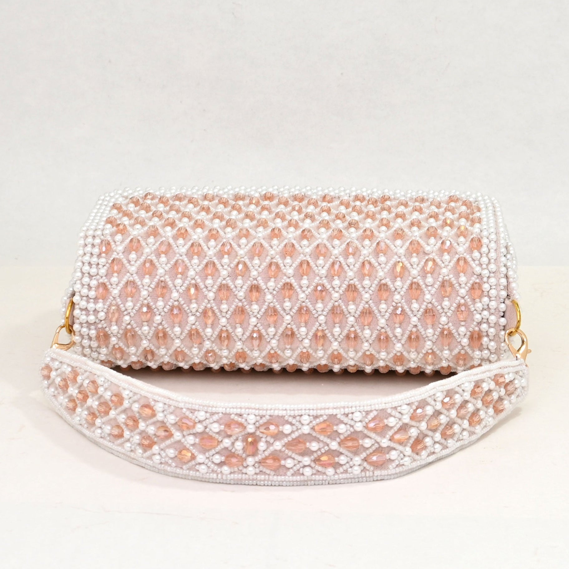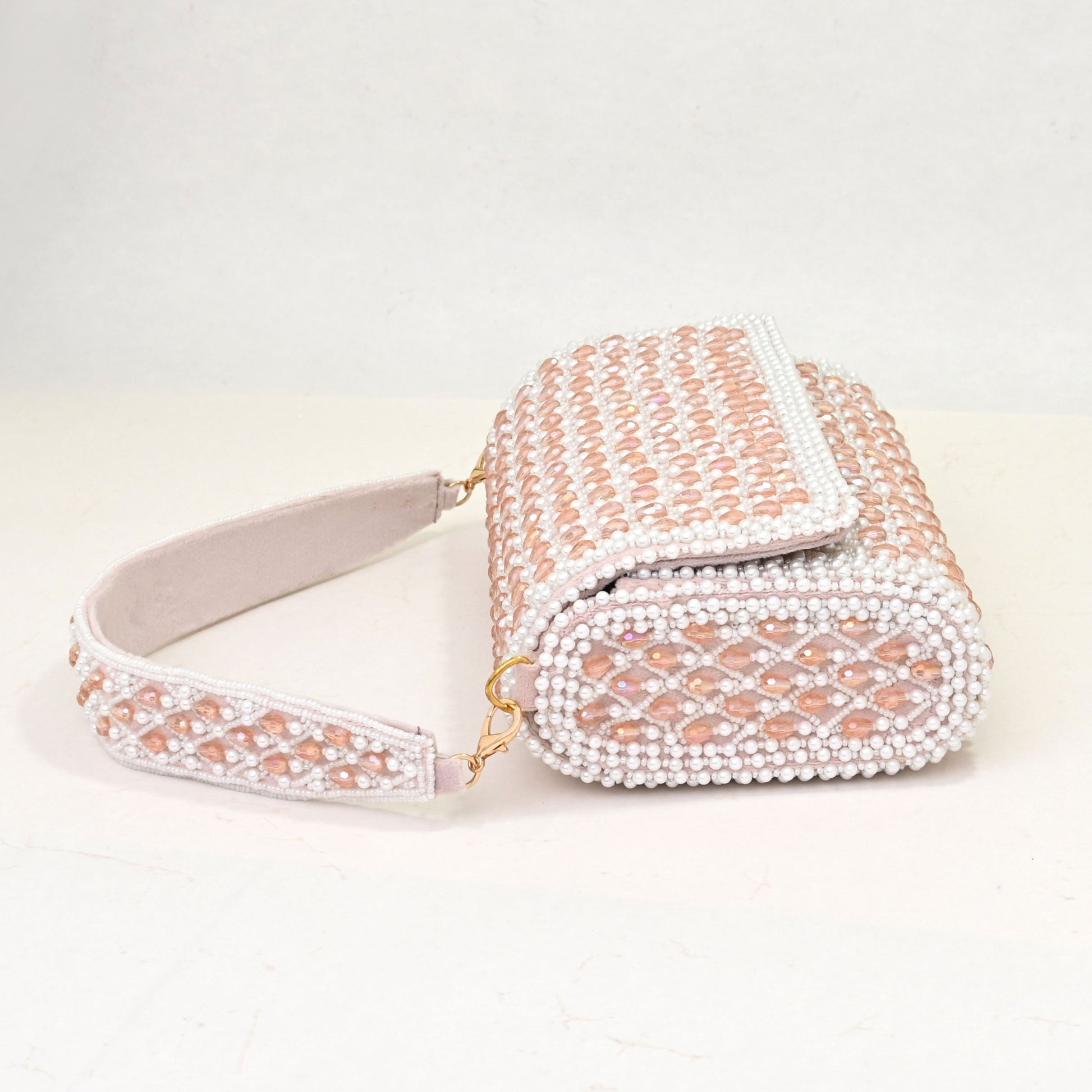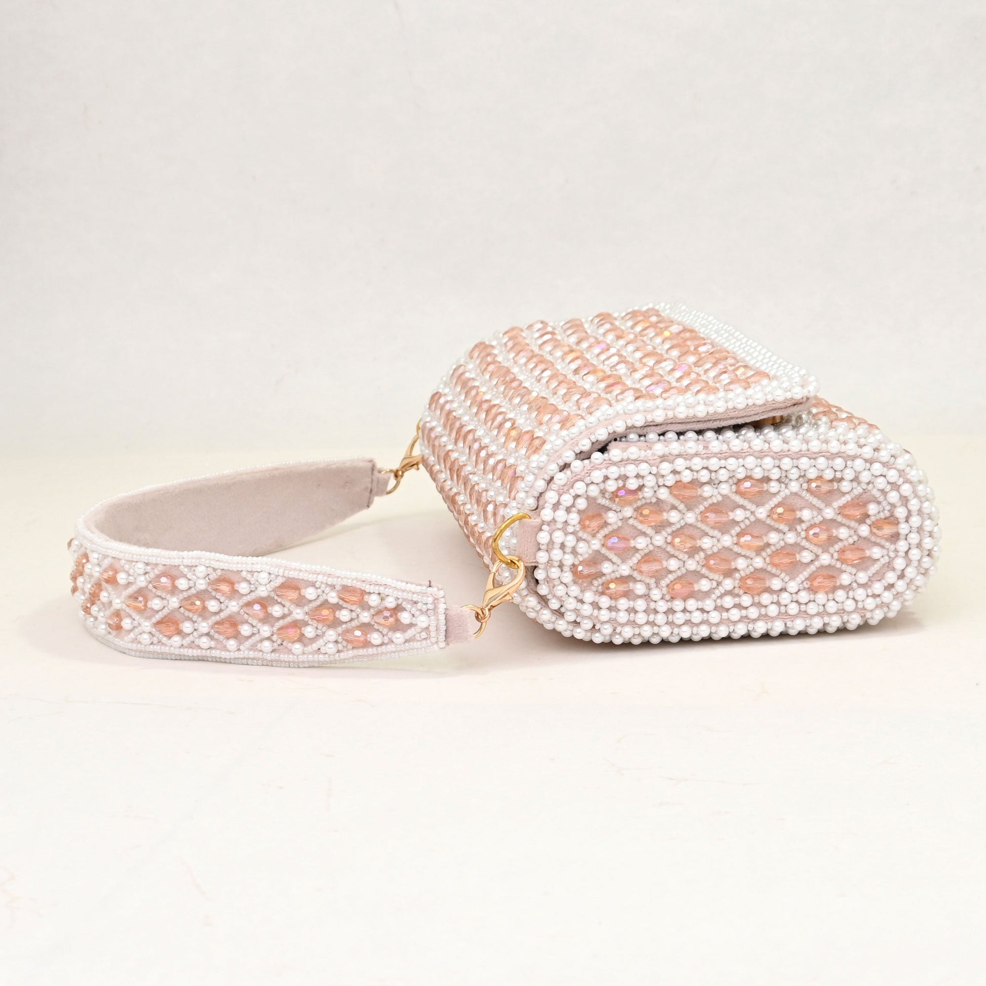 Premium Materials : Designed with precision, the sturdy form is complemented by pearl embellishments and soft interior lining, ensuring durability without compromising on aesthetics. The bag comes with a detachable embellished strap and a crossbody sling option. Whether you prefer hands-free convenience or a classic hand-held style, this bag adapts seamlessly to your needs.