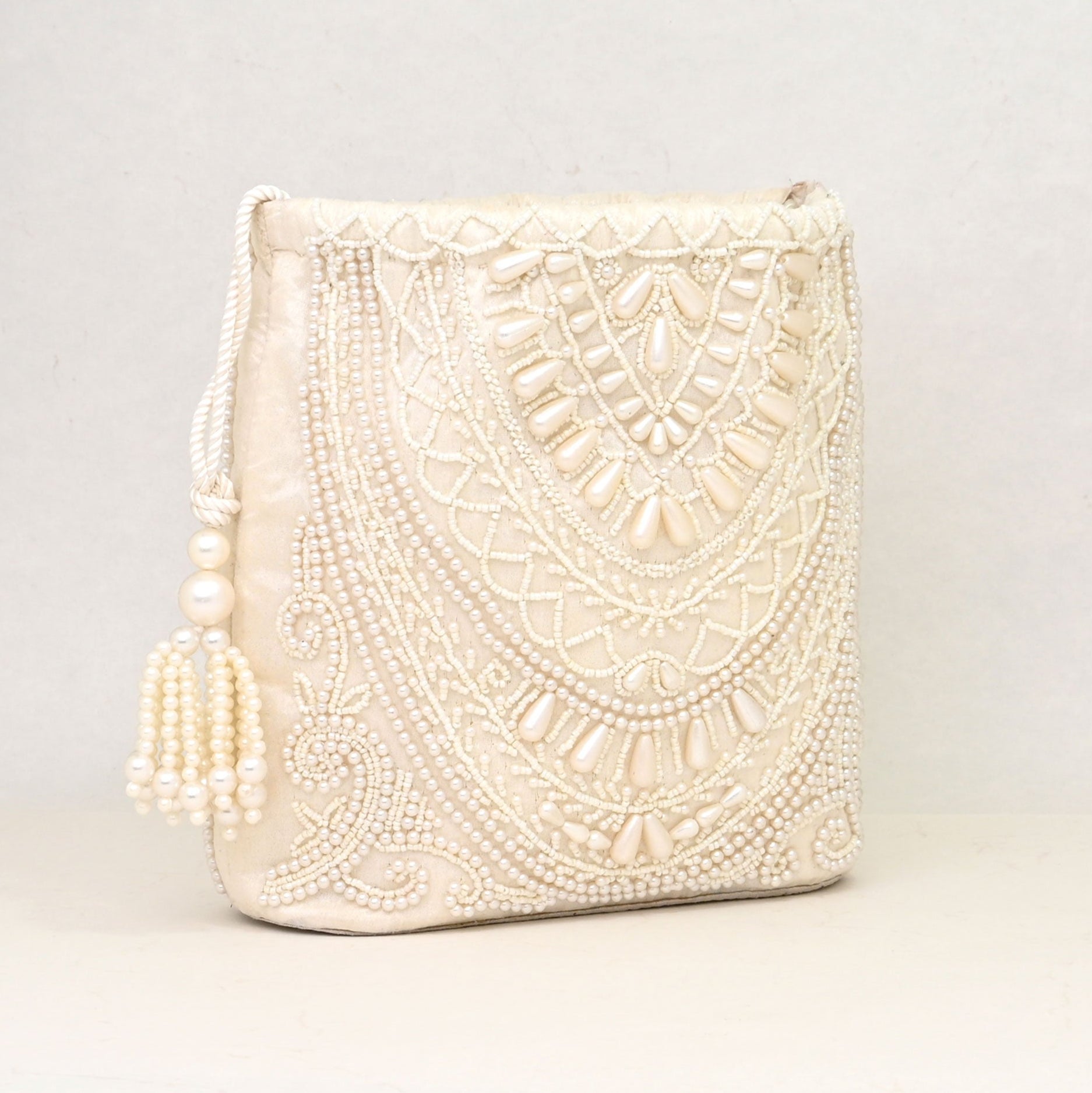 Impeccable Craftsmanship : This bag is adorned with lustrous cream pearls, meticulously arranged to form a stunning necklace-like effect along the bag's circumference. The pearls add a layer of rich texture, elevating the bag from simple to extraordinary. The creamy base fabric further enhances its luxurious appeal, making it a versatile accessory for any occasion.