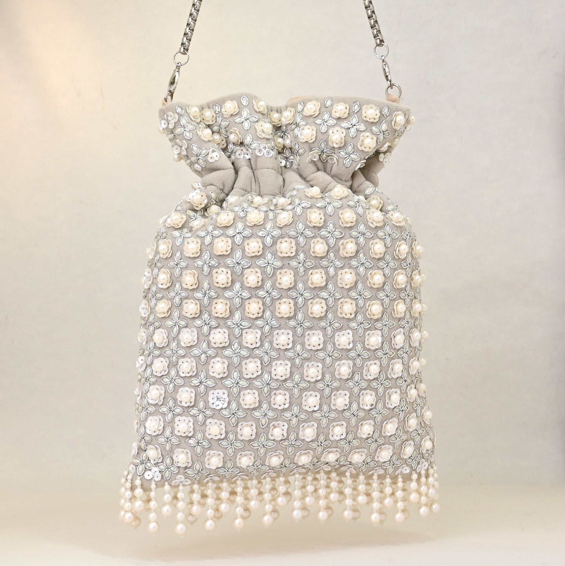 Luxurious Velvet & Intricate Embroidery : Made from rich ivory velvet, the bag features detailed thread work with sparkling embellishments that enhance its opulent appeal. The delicate floral motifs and intricate patterns capture the essence of artisanal craftsmanship, making it a statement piece for any occasion.