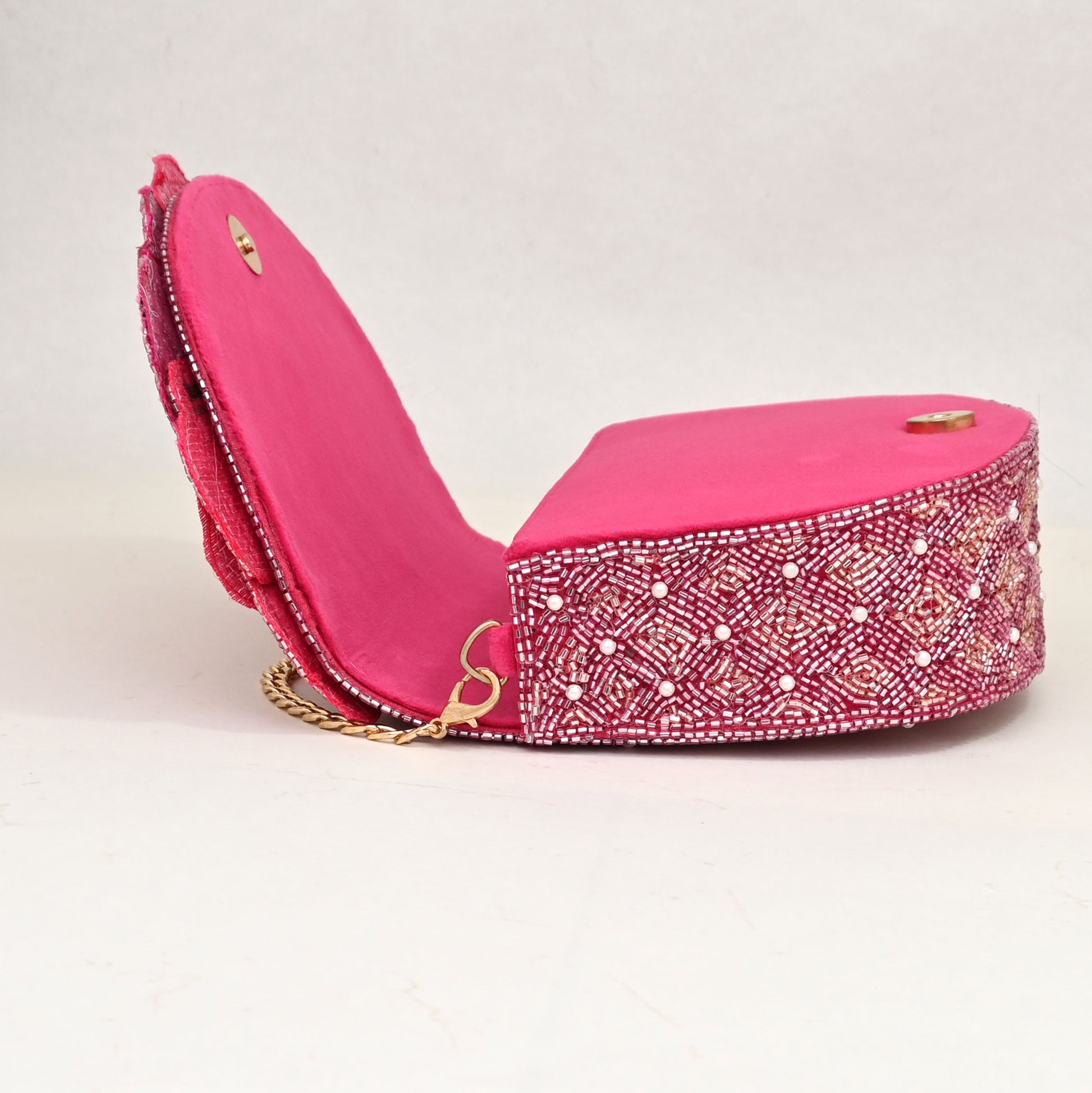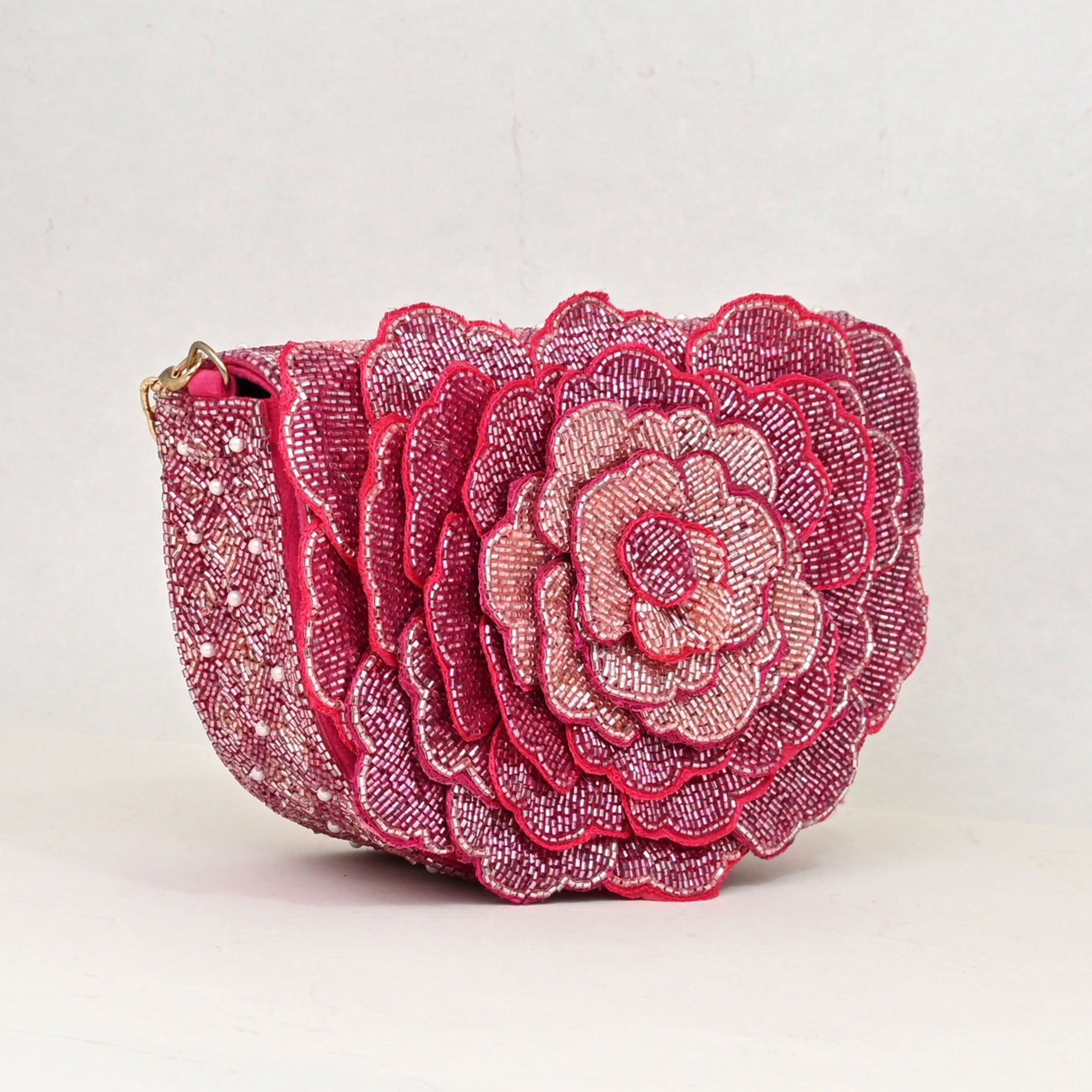 Intricate Craftsmanship : Hand-embellished with thousands of radiant glass beads, the bag blooms into a sculptural floral design, showcasing a meticulous play of ombré pink hues.