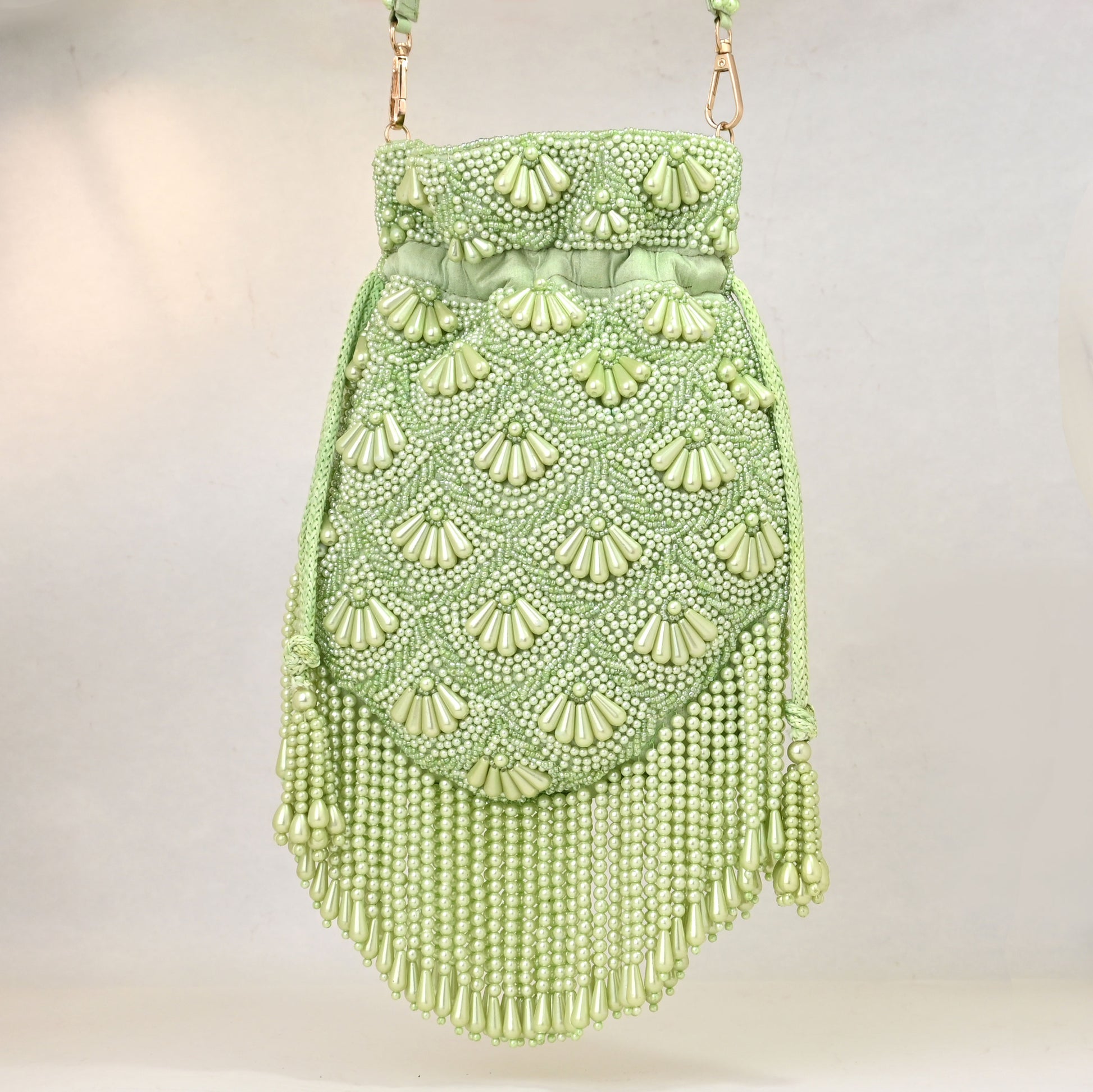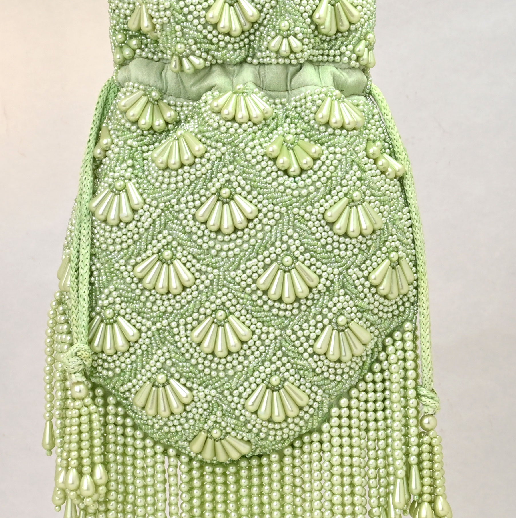 Artisanal Craftsmanship : Set against a soft, sage-green base, this bag features delicate hand-embellished pearls and intricate beadwork, forming graceful scalloped patterns. The cascading pearl fringe adds a dreamy, fluid movement, catching the light with every step.