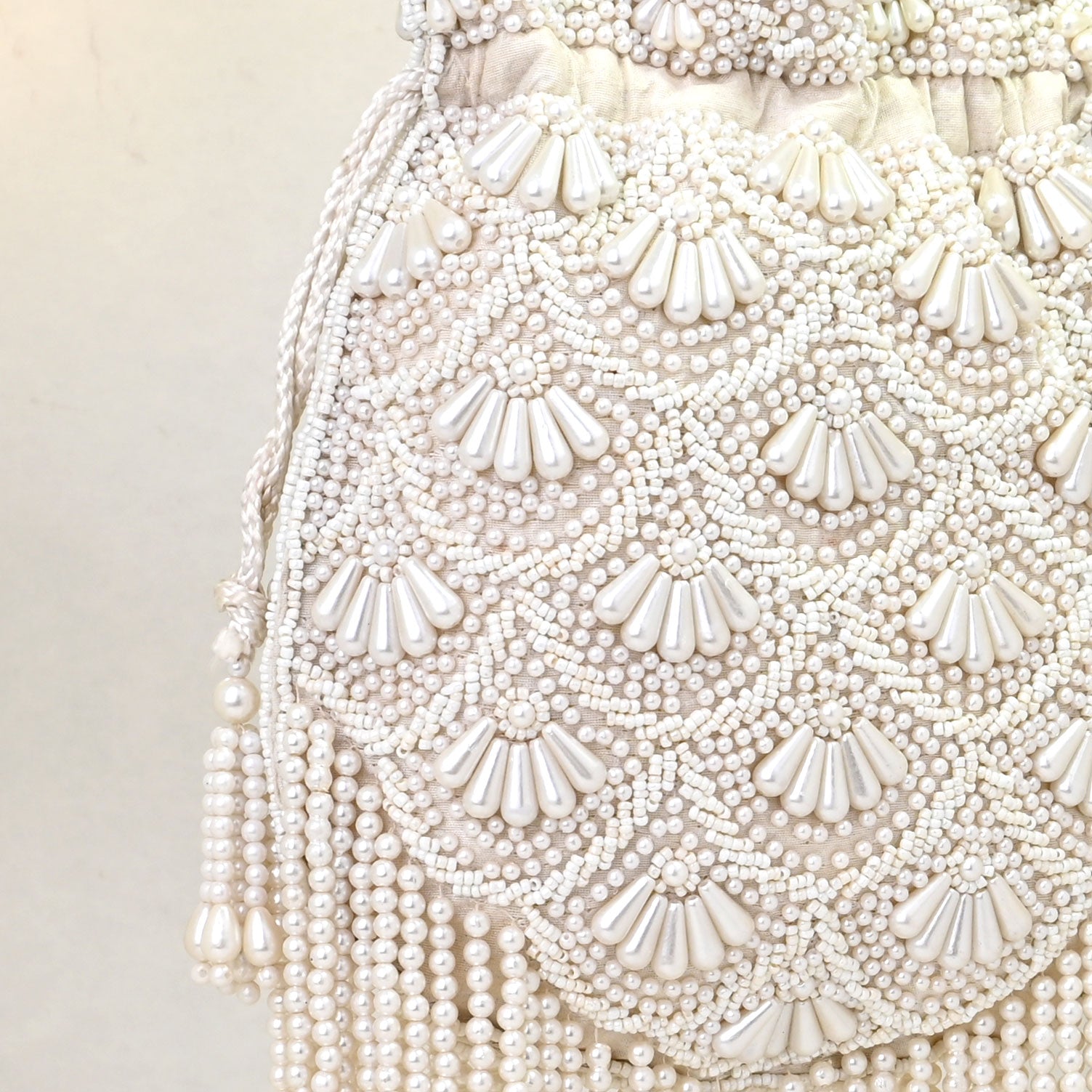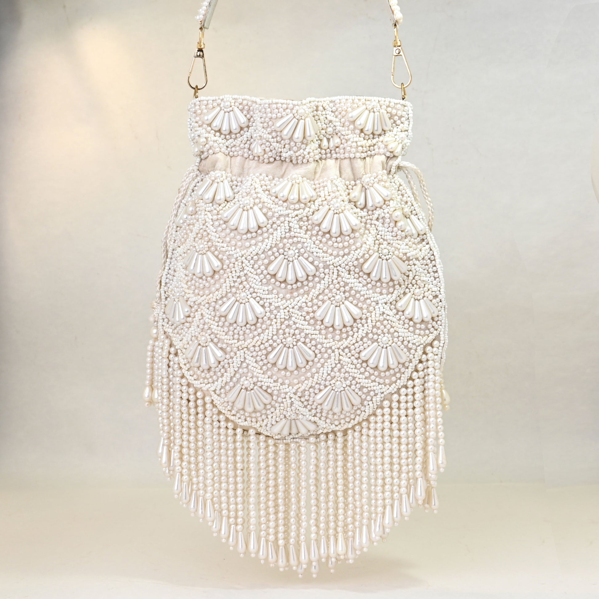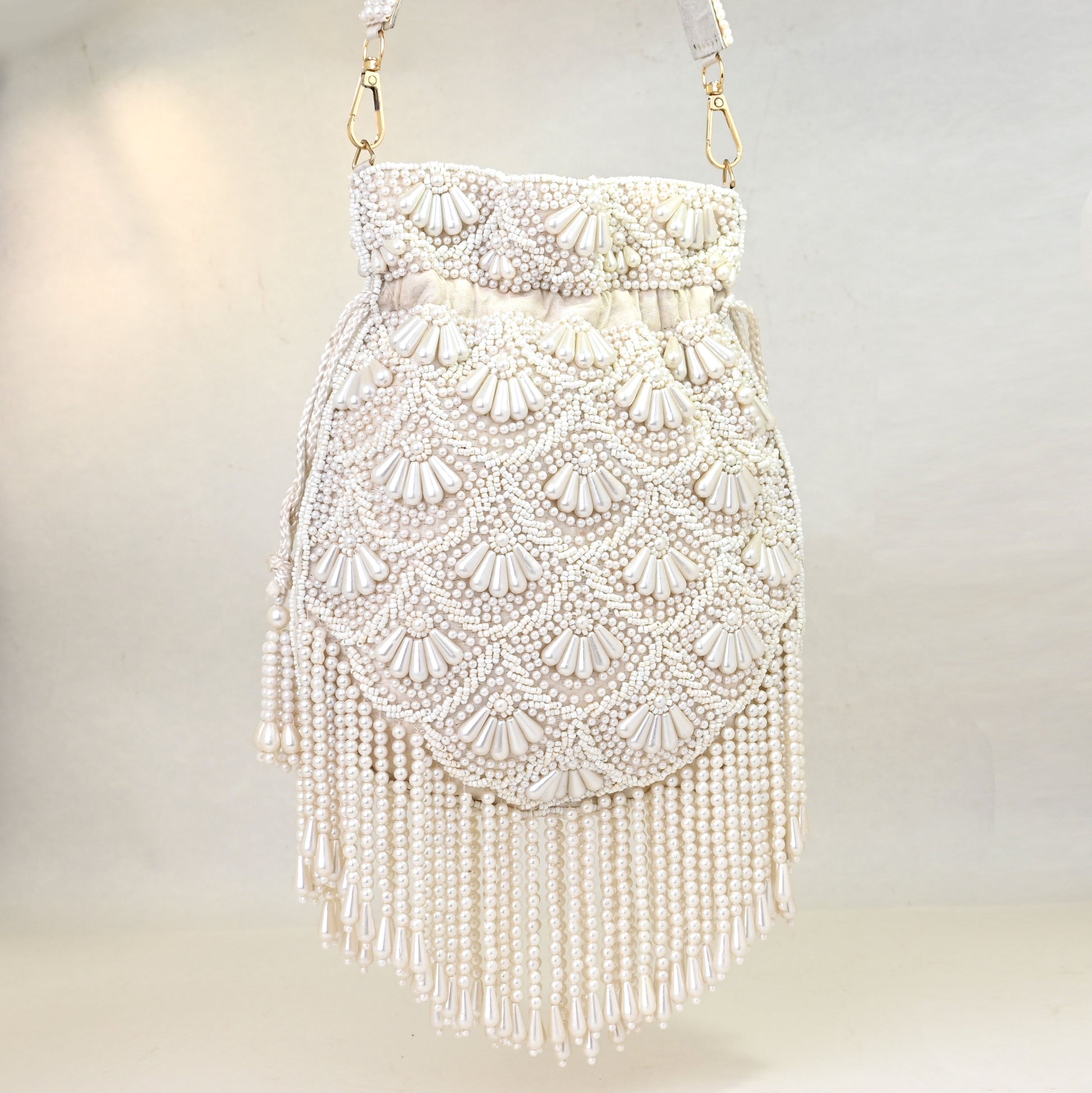 Elegant Silhouette : The timeless shape combines sophistication and utility, offering an effortless style statement. The pearl-accented drawstring closure completes the design, ensuring both function and finesse. The bag comes with a detachable embellished strap. Whether you prefer hands-free convenience or a classic hand-held style, this bag adapts seamlessly to your needs.